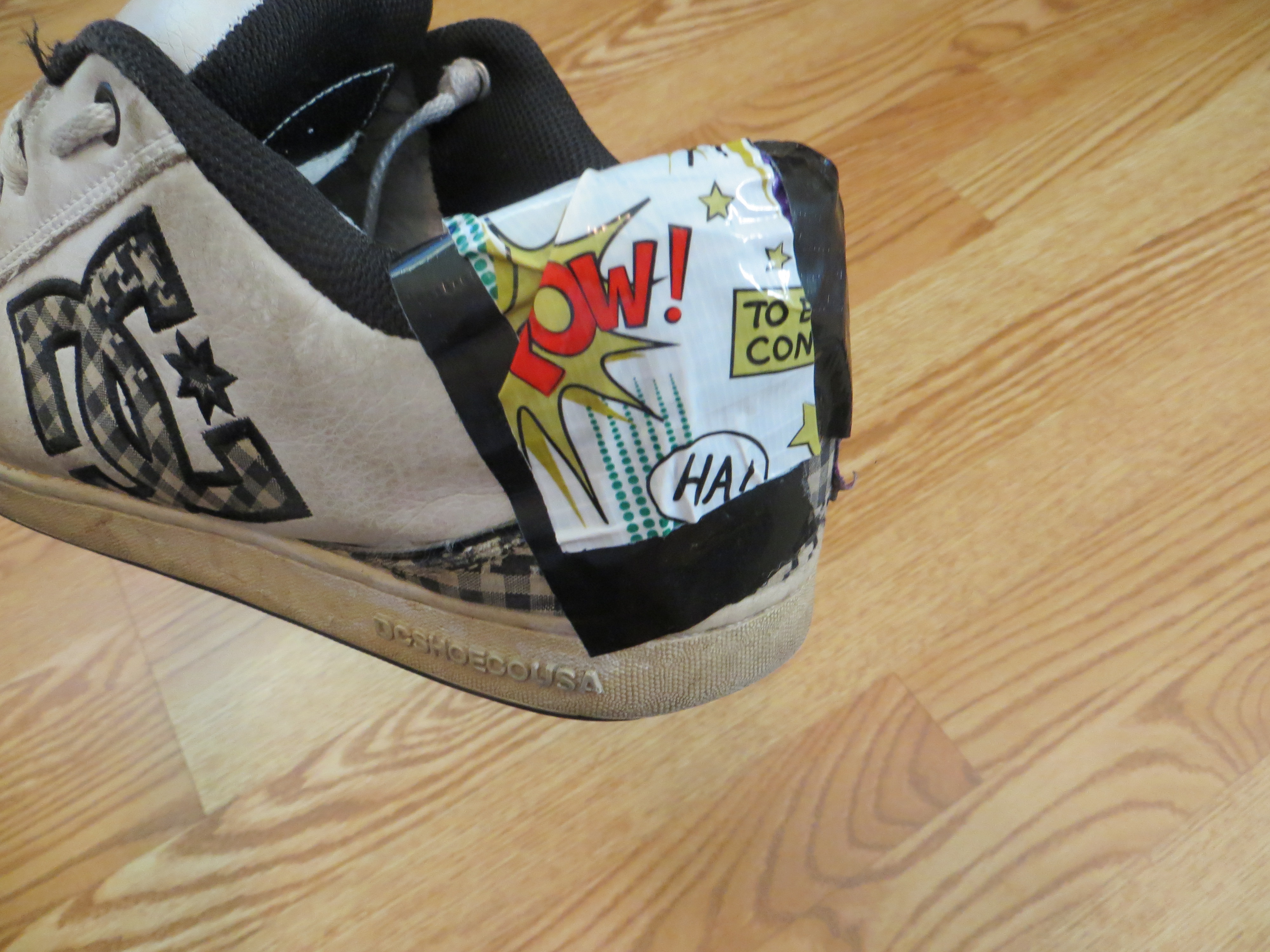 “Oh, no”, she replied. Her chuckle indicated this wasn’t the first time she had been asked this question. “I can’t bear to let go of these comfy shoes. When the heel areas fell apart, I started to duct tape the parts that were broken and torn.”